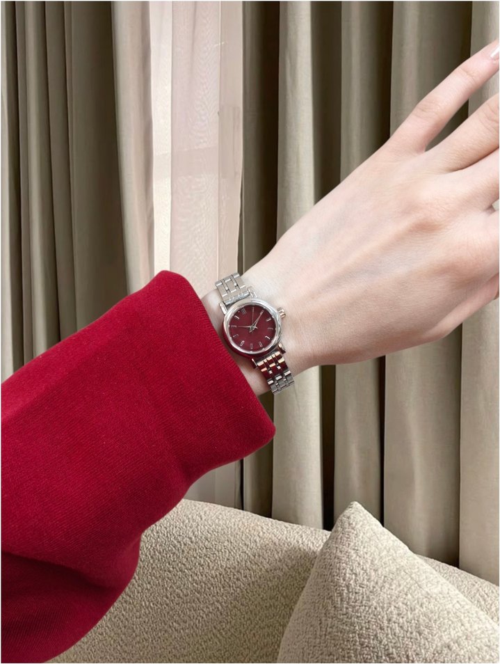 Bordo parlak kadran ve kemerli gümüş metal kayışa sahip kadın saati, minimalist ve çağdaş tarzı yansıtır. ⌚