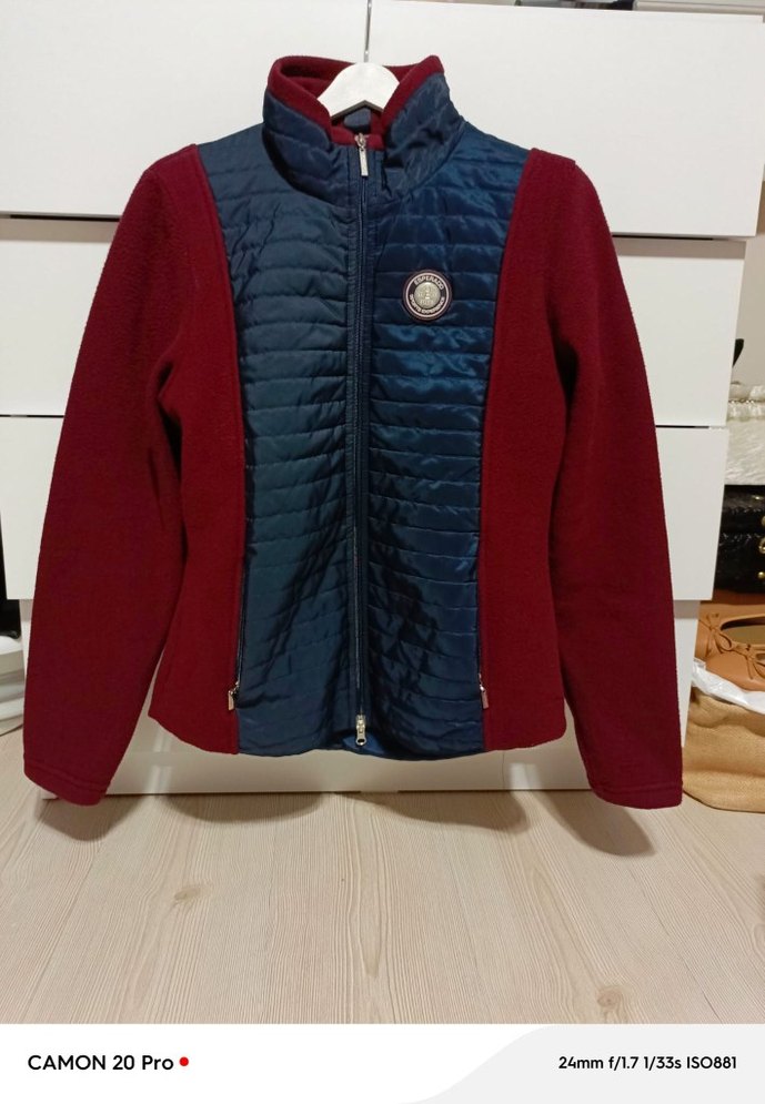 Bu kadın montu yüksek yakalı ve düğmeli ön kısmıyla, bordo yumuşak kumaş kollar ve koyu mavi kapitone ön kısmı bir araya geliyor. Günlük kullanıma uygun, trend sokak stili.