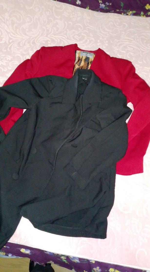 2 adet vatkalı blazer ceket biri siyah biri bordo bordo olanın içi kolları floroparlı içi boyun kısmı ve cep kısımları leoparlı çıkardığınızda tersinde kolları leoparlı ikisi de vatkalı yıkayıp hemen kullanabilirsiniz yırtıkları vesaire yok siyah olan da diğerine nazaran daha uzun ve yumuşak kumaştan.