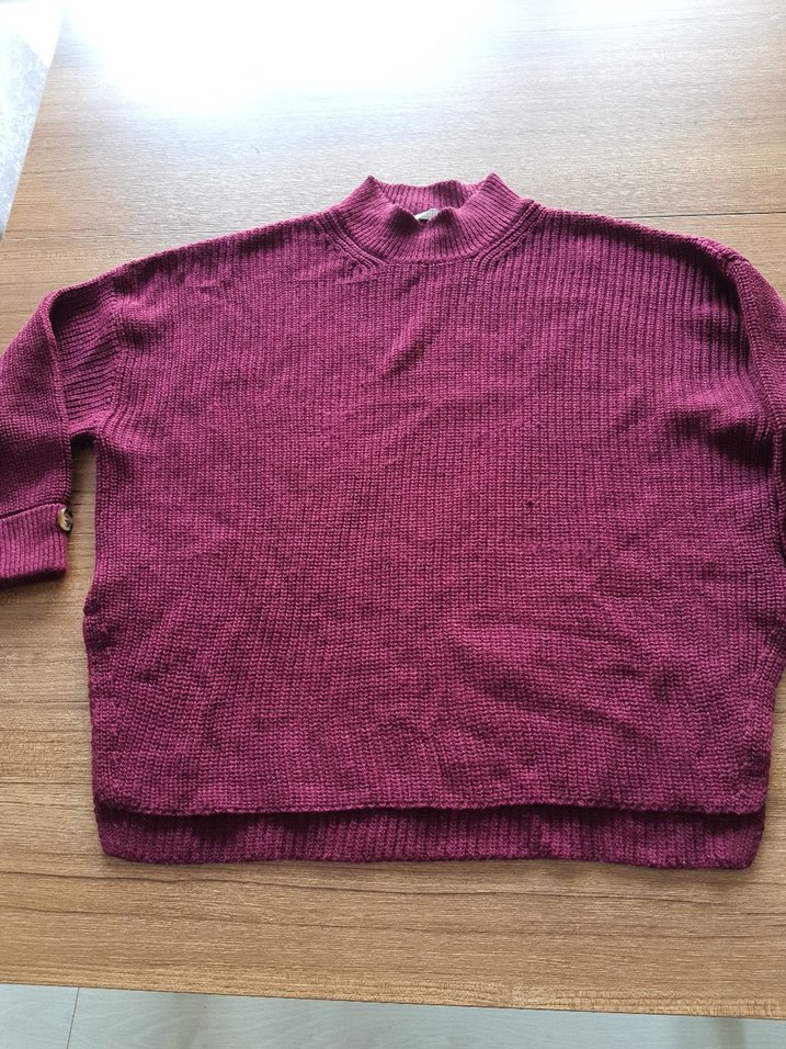 Bordo renkli, örgü kumaştan yapılmış, bisiklet yaka ve uzun kollu, bol kesim, normal boy kadın kazak. Sade ve rahat normcore tarzına uygundur.
