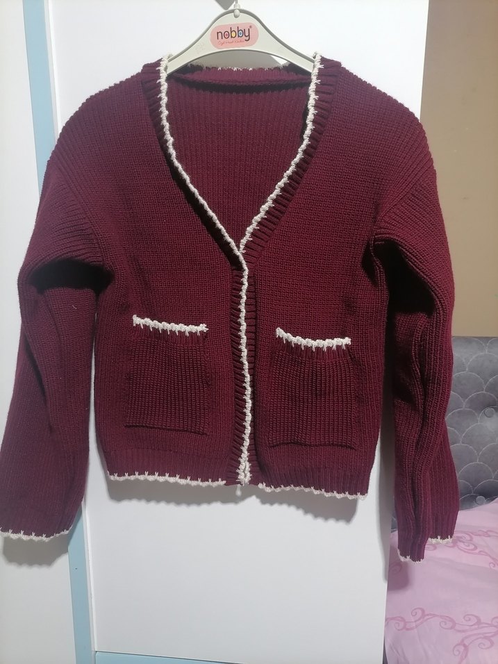 Beyaz detaylı, bordo renkli, örgü uzun kollu ve normal midi boyda, cepli, fitted kesim kadın hırka. Rahat ve gündelik kullanıma uygun.