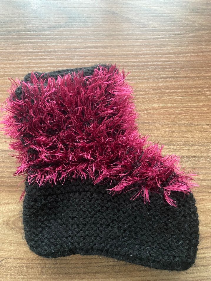 Kadın patik , koyu bordo örgü taban ve kabarık detaylarla rahat ve şık bir görünüm sunar.