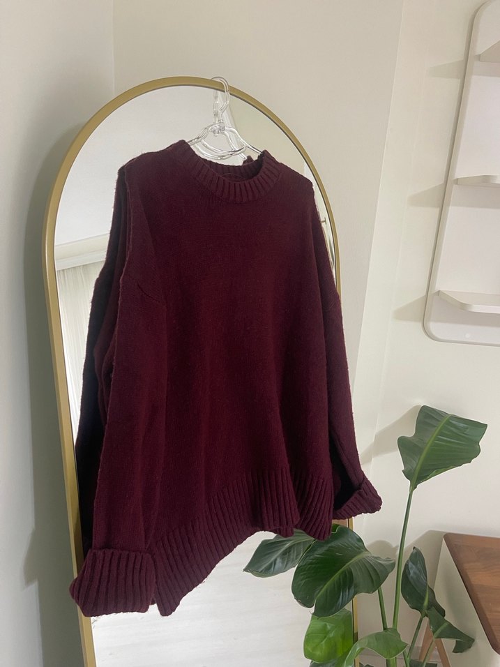 Bordo renkli, yuvarlak yaka ve uzun kollu örgü triko. Salaş kesim ve normal midi boy uzunluğa sahiptir. Günlük kullanım için uygundur.