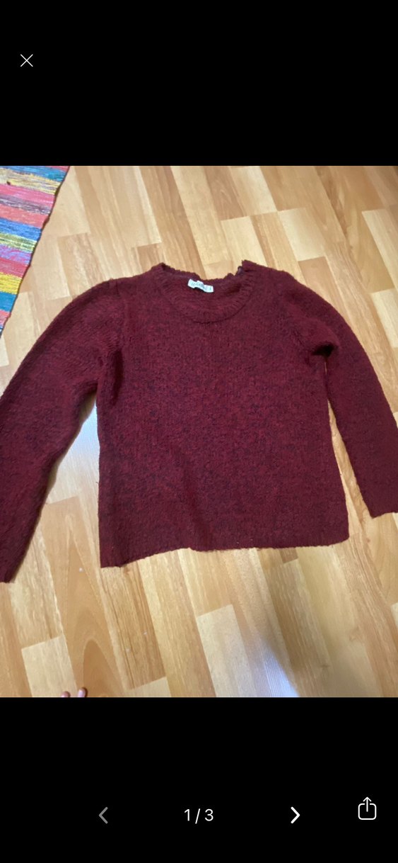 Bordo renkli, uzun kollu, yuvarlak yakalı ve bol kesim örgü kazak. Günlük kullanıma uygun sade ve rahat bir model.