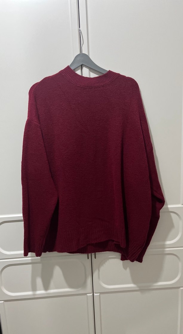 Bordo renkte, yuvarlak yaka ve uzun kollu kadın kazak. Yün örgü kumaştan, rahat ve salaş kesim. Günlük kullanım için uygun, sade ve koyu renkte.