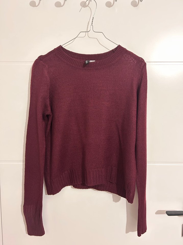 Bordo renkli, uzun kollu, yuvarlak yakalı örgü yün kazak. Rahat kesimi ve normal boyuyla günlük kullanıma uygundur.