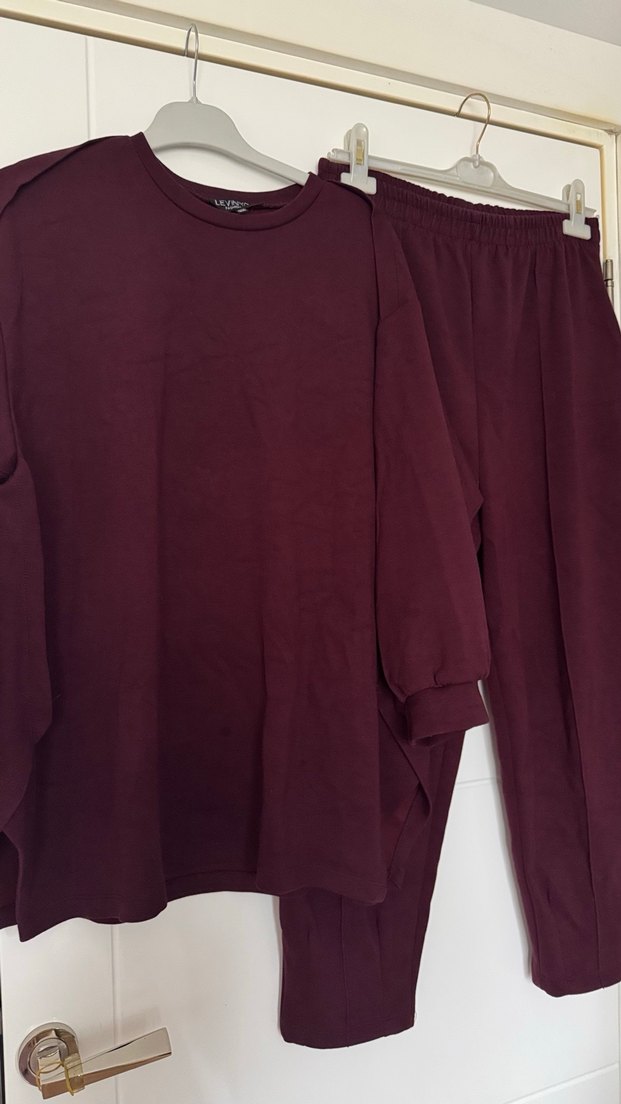 Bordo boyu renk keten kumaştan, uzun kollu bisiklet yaka üstü drapeli ve salaş kesim altı olan günlük kullanıma uygun eşofman takımı.