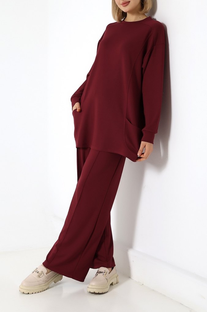 Bordo renkli, uzun kollu ve salaş kesime sahip kadın takımı. Düz ve rahat yapısıyla günlük kullanıma uygun, sentetik kumaştan üretilmiştir. 1 ve 2 beden vardr
