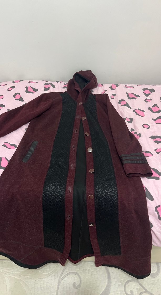 Düğmeli, bordo uzun kaban, yumuşak ve sıcak kumaştan üretilmiştir. Uzun kollu, kesimi oturan ve gotik tarzda günlük kullanıma uygun bir modeldir.