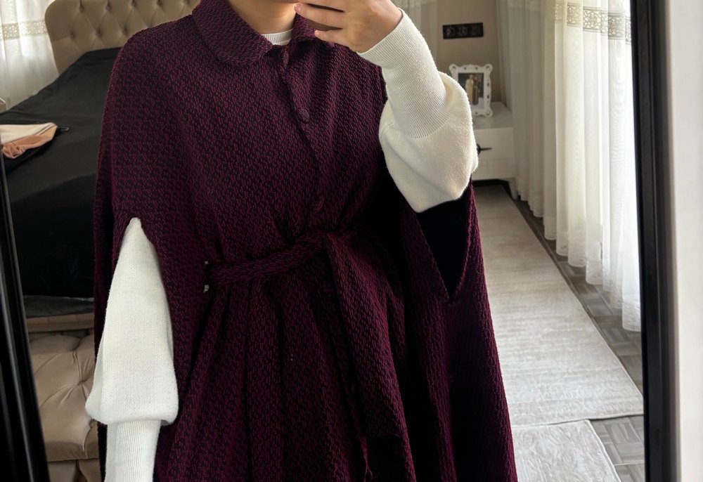 Bu bordo kadın kuşaklı panço örgü dokusu ve kuşak detayıyla rahat ve klasik bir görünüm sunar.
