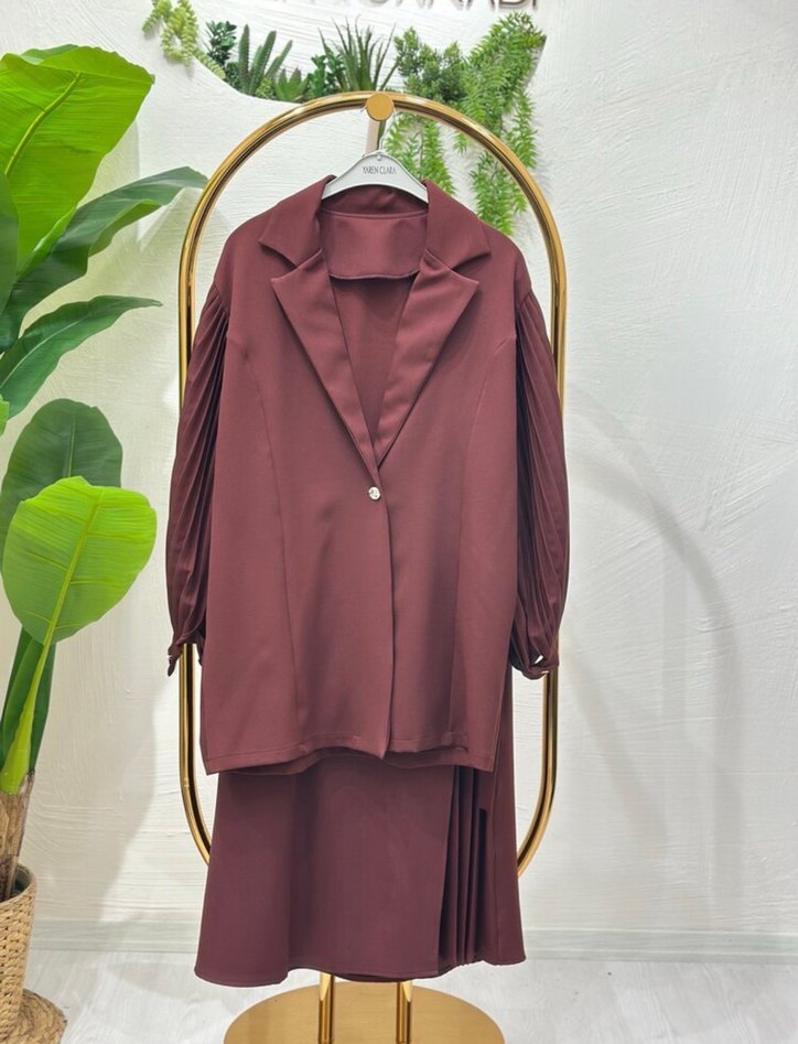 Bordo renkli kadın takım elbisesi, uzun boy ve regular fit kesime sahiptir. Uzun kollarda pilili detaylar bulunur. Modern klasik tarzda, yakası kesik ve sentetik kumaştan üretilmiştir. İş ortamı için uygundur. 38-40 beden uyumludur.