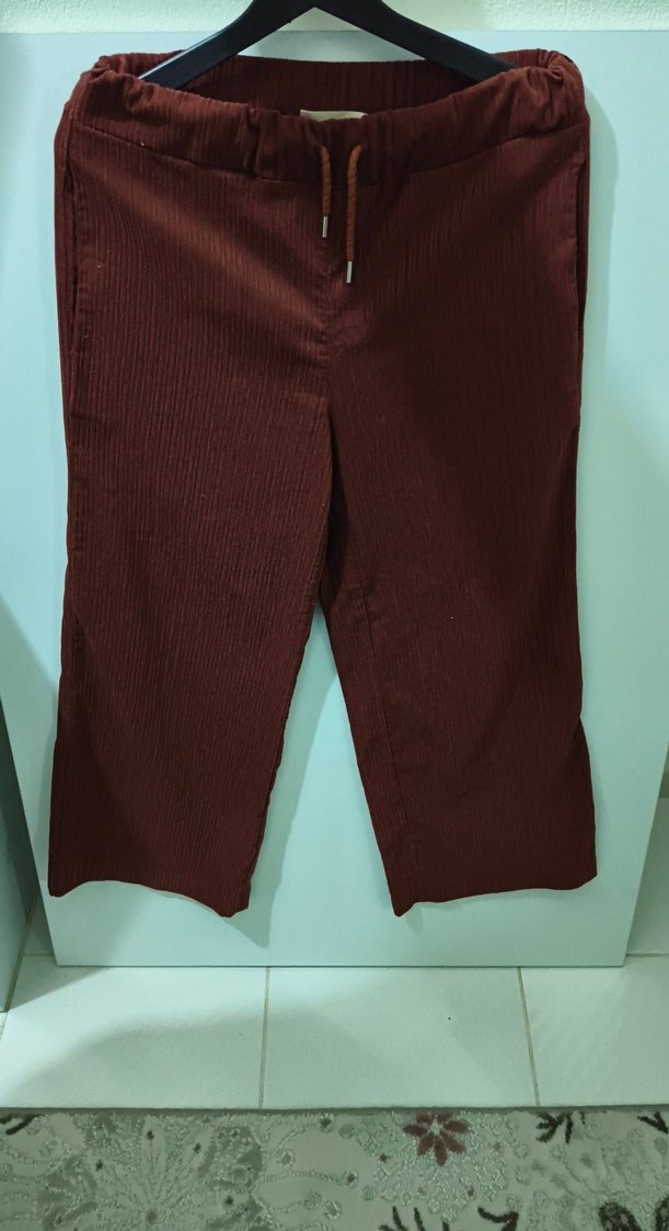 Bordo renkli, piliseli kumaş pantolon, kadınlar için midi boy ve rahat kesimdedir. Yumuşak sentetik kumaştan yapılmış, günlük ve sokak stiline uygundur.