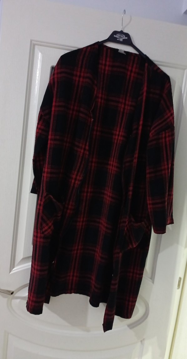 Bordo renkli, uzun kollu ve gevşek kesim kadın ceket. Uzun boyda, rahat ve gotik tarzda tasarlanmıştır. Desensiz ve konforludur. kareli desenlidir tofisa dan aldım biraz kulladim artık kullanmıyorum. hafif tüylenme Şi var o yüzden uygun a vereceğim çok kalın değildir. mevsimlik uzunluğu 101 cm iki kol altı arası 58 santim