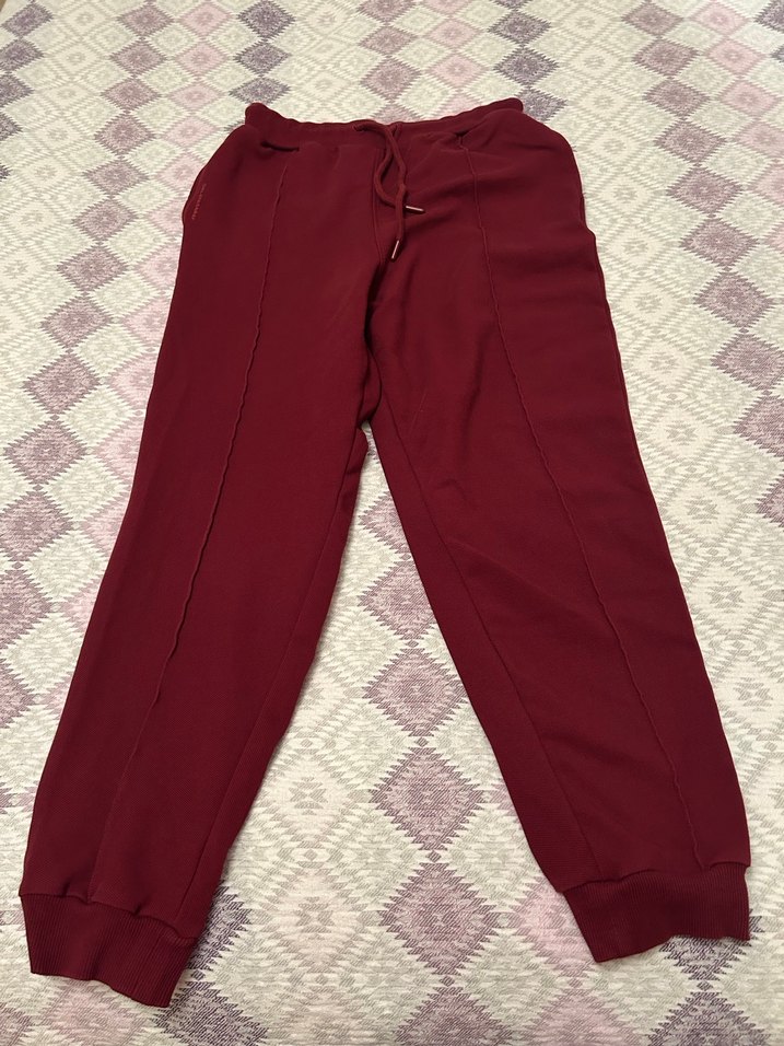 Bordo renkli, bol kesim kadın eşofman altı, fermuarlı cepleri ve yumuşak sentetik kumaşıyla günlük rahatlık sağlar. Trendy ve rahat bir stil için ideal. Sayılı giyildi.