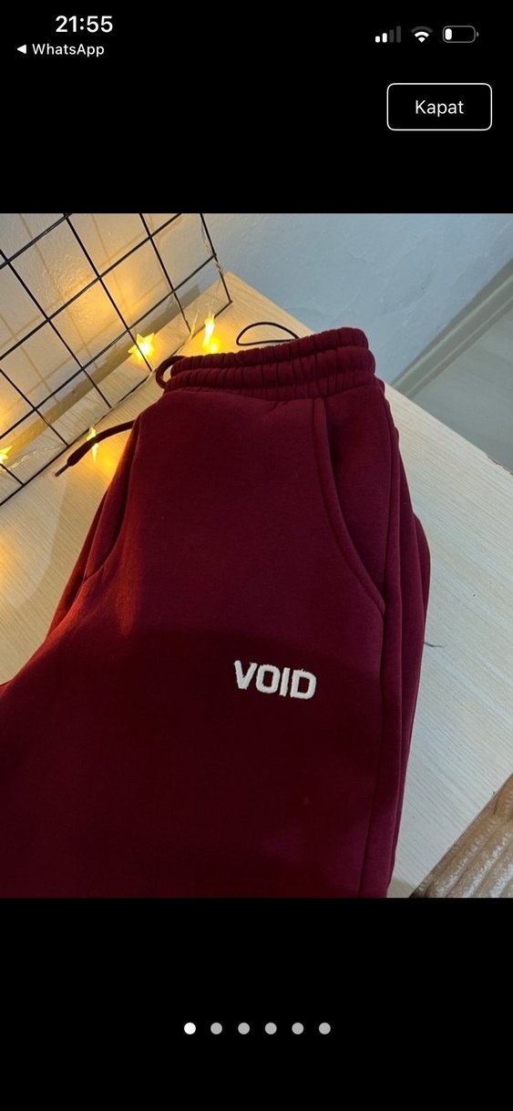 Bordo renk, rahat kesim kadın sweatpant. Yumuşak ve sıcak kumaş, Velcro detay ve "VOID" baskılı tasarım içerir. Günlük sokak stiline uygun.