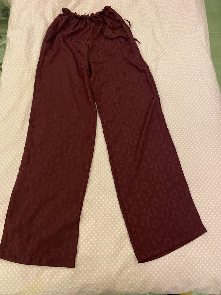 Bordo renk, salaş kesim, leopar desenli , ipeksi kumaştan günlük rahat kullanım için bohem tarzında pantolon.