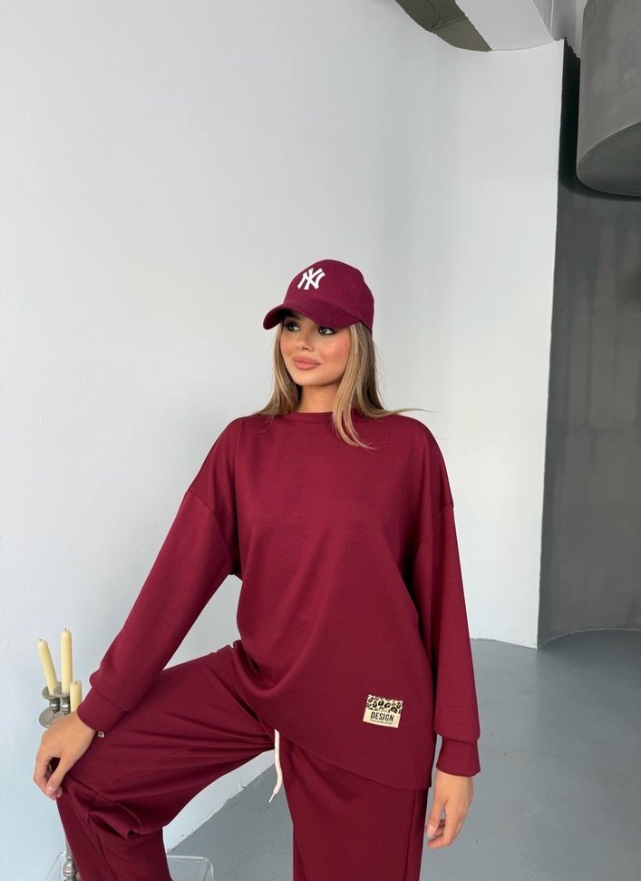 Bordo renkli, salaş kesim ve yuvarlak yakalı kadın spor takımı. Yumuşak ve sıcak kumaştan, günlük kullanıma uygun rahat bir şıklık sunar. ♀️S M L XL bedeni mevcuttur.