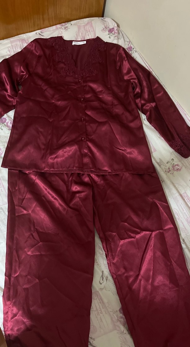 Bordo renkli saten kumaştan yapılmış, uzun kollu ve midi boyda bol kesim pijama takımı. Rahat ve klasik tarzda, parlak dokulu.
