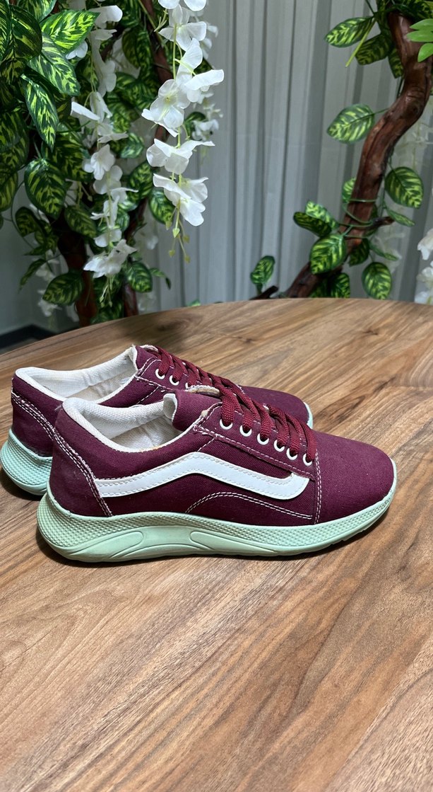 Bordo renkli kadın spor ayakkabısı, dolgu topuk ve kauçuk tabanlı. Renkli batik desenle trend athleisure tarzında, rahat ve şık.