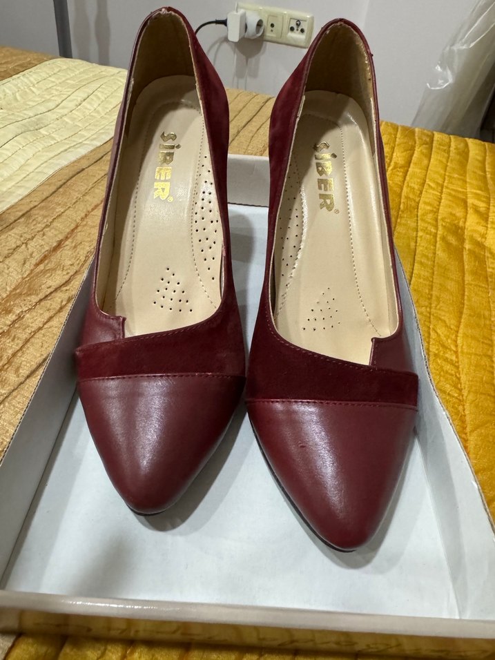 Bordo renkli, blok topuklu stiletto.Deri ve süet karışımı.Çok az kullanıldı.Topuk yüksekliği 9 cm .İhtiyaç fazlası olduğu için satıyorum.Çok küçük bir yerinde boya da nokta şeklinde açıklık var.Resimde görüldüğü gibidir.