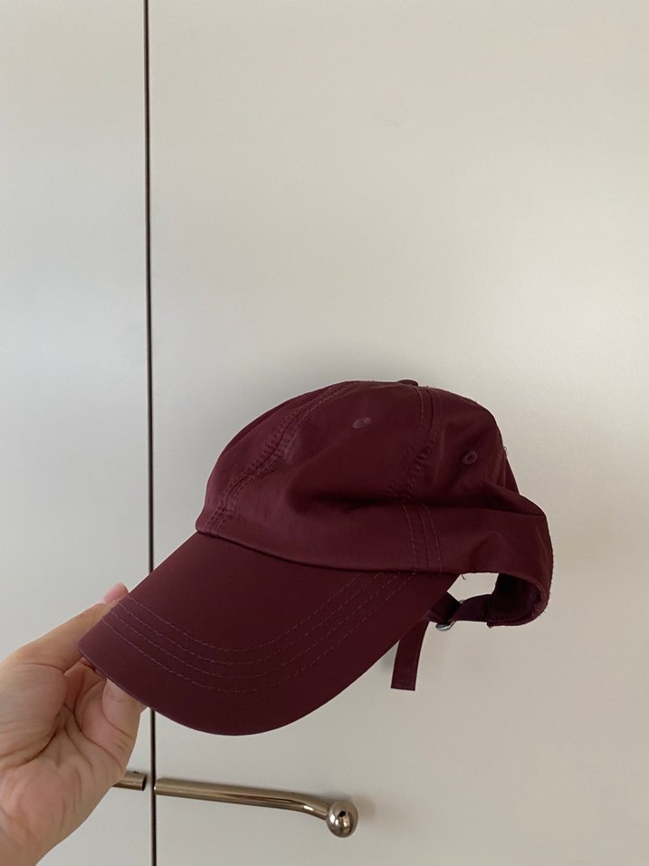 Bordo renkli, satenimsi dokulu kadın şapkası, minimalist ve street wear tarzıyla zahmetsiz şıklık sunar. Sade ve temel tarzlara uygundur. Hiç kullanılmadı H& marka popüler bordo şapka