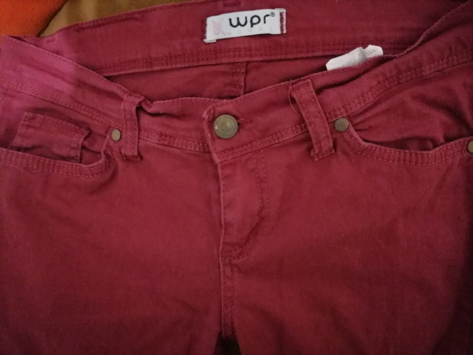 Bordo renk, düğmeli, süet kumaştan yapılmış, normal boy ve dar kesim kadın pantolonu. Günlük sokak stili için uygundur. Marka: wpr.