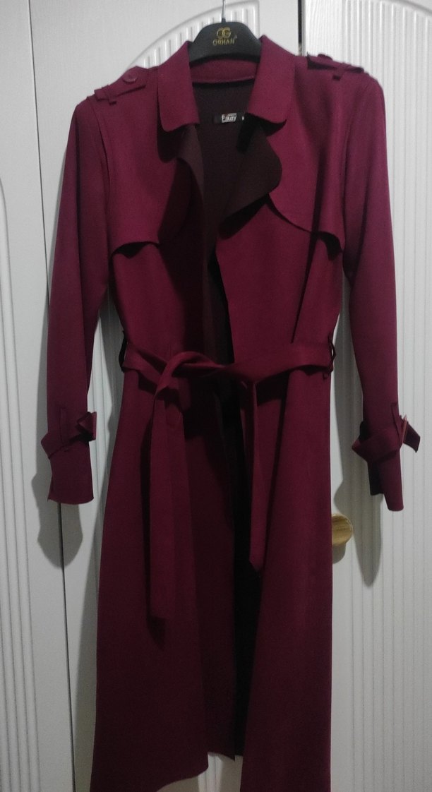 Bordo renkte, uzun süet trençkot, kuşaklı ve regular fit kesime sahip. Notch yaka ve düz deseniyle ofis şıklığına uygun Paris tarzı sokak giyimi. M beden boy:107cm omuz : 40cm 1-2 kez giyildi