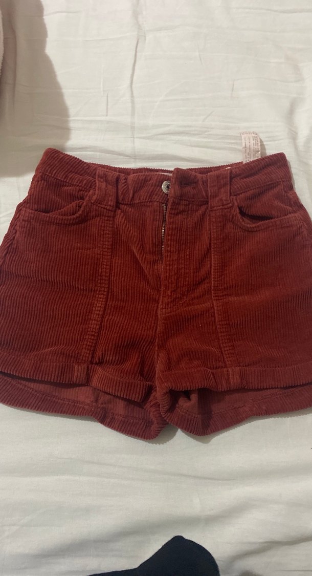 Bordo renkli, düğmeli ve süet kumaştan yapılmış, rahat kesim mini şort. Günlük kullanım için uygun, trend sokak stiliyle uyumlu.