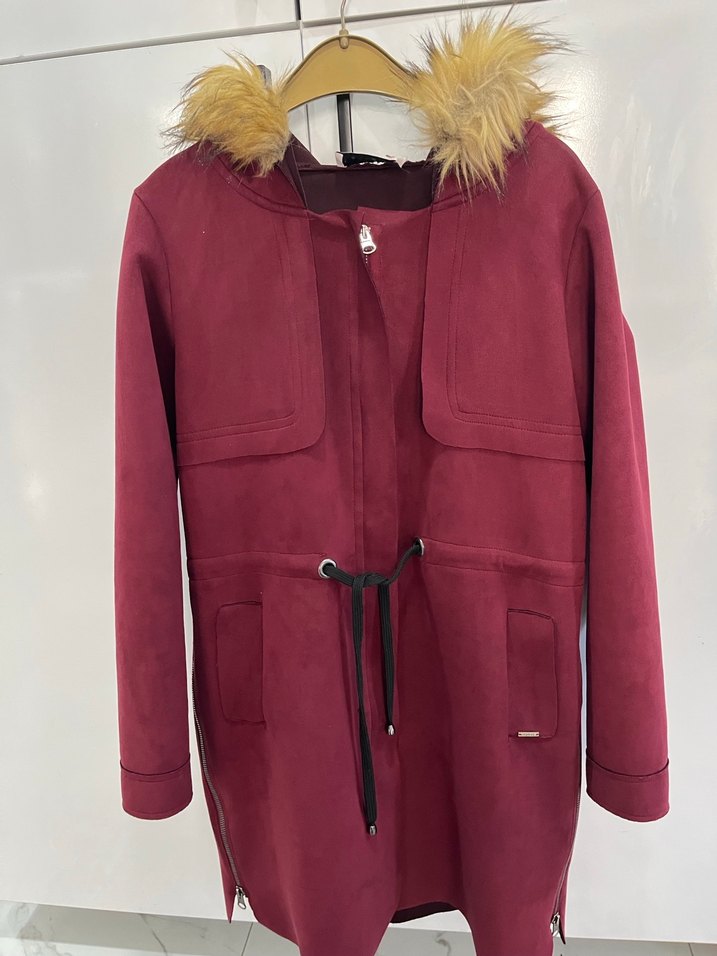 Bordo süet uzun ceket, bol kesim ve uzun kolludur. Kapüşonunda kürk detayı ve belde bağcık bulunur. Rahat ve günlük kullanıma uygundur.