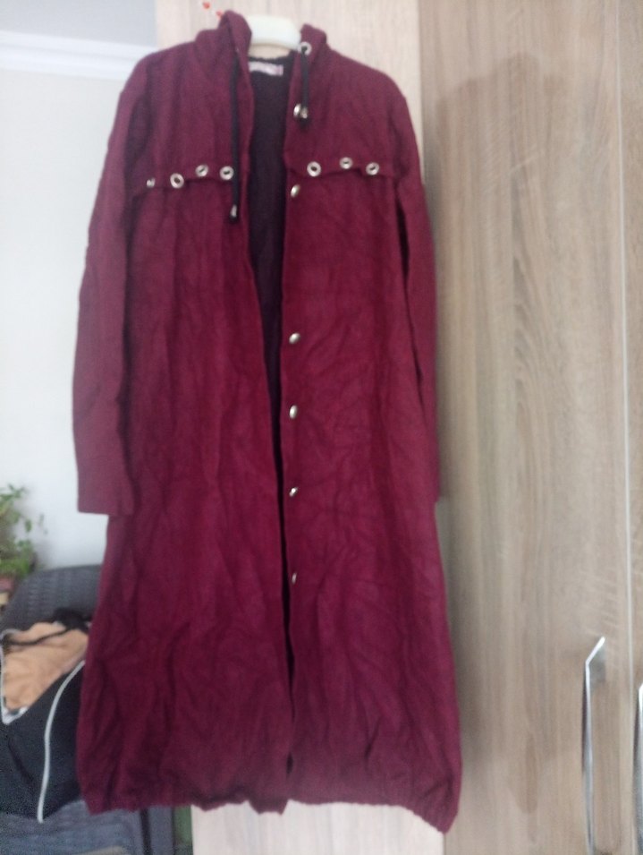 Bordo renkte, uzun boy, düğmeli, bol kesim süet kaban. Uzun kollu ve yakası kesik detaylı, rahat ve bohem tarzda günlük kullanım için uygundur.