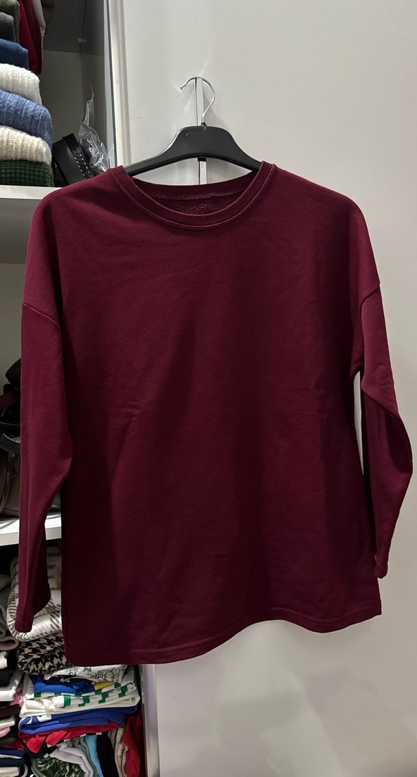 Bordo uzun kollu, yuvarlak yaka ve bol kesim sweatshirt. Yumuşak ve sıcak kumaştan, minimal ve normcore tarzda, günlük kullanım için uygun.