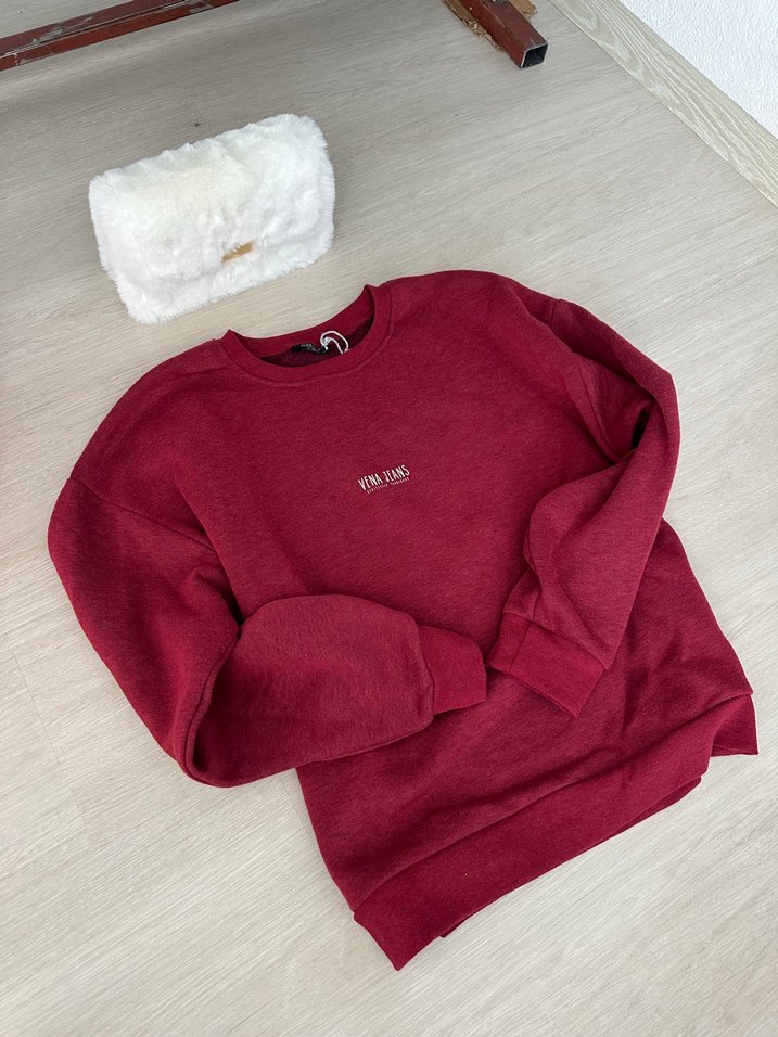 Bordo renkli, bisiklet yakalı ve uzun kollu kadın sweatshirtü. Yumuşak ve sıcak kumaştan, rahat kesimli, günlük sokak stili için uygun sade ve deseniz bir model.
