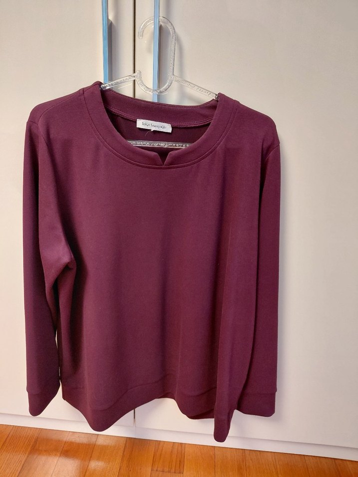 Bordo renkli, yuvarlak yakalı ve uzun kollu kadın sweatshirtü. Rahat kesimi ve sade tasarımıyla günlük kullanım için uygundur. Yumuşak ve sıcak kumaştan üretilmiştir.
