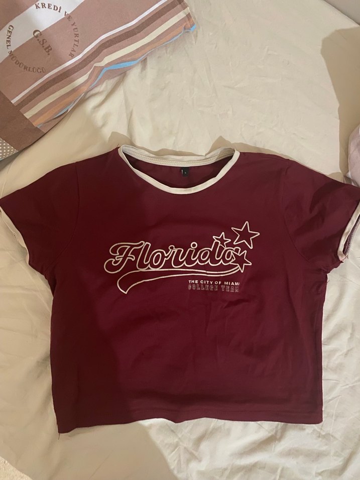 Bordo pamuklu, kısa kollu ve bisiklet yaka tişört. Gevşek kesim, baskılı 'Florida' yazısı ve yıldız detayları bulunur. Günlük kullanıma uygun rahat stil.