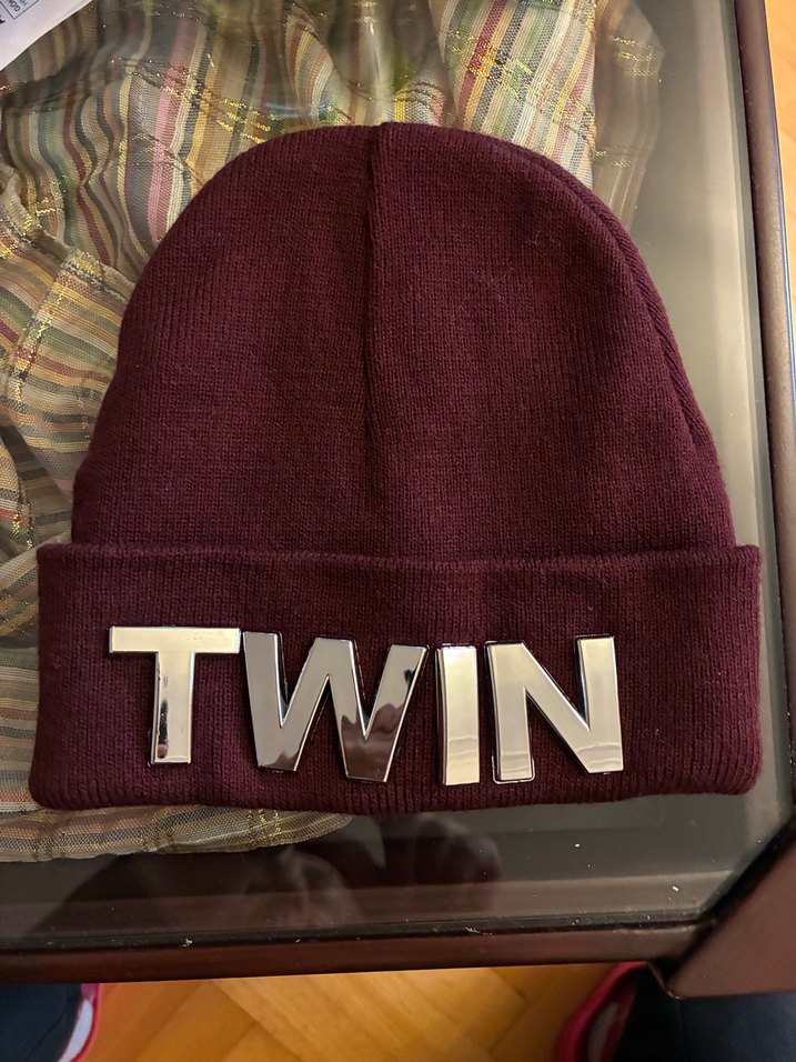 Bordo triko kadın bere, önünde "TWIN" yazısı ile sokak stiline uygun rahat bir tasarıma sahip.