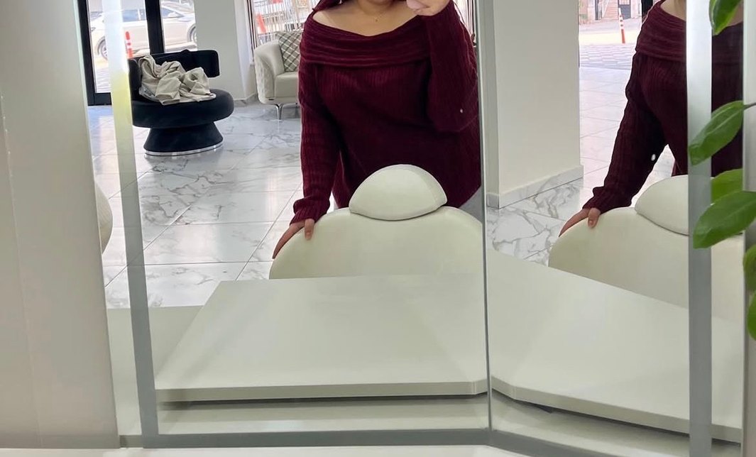 Bordo renkli, kayık yaka ve uzun kollu, fitted kesim örme kazak. Parlak yüzeyli, midi boyda günlük kullanıma uygun şık parça.