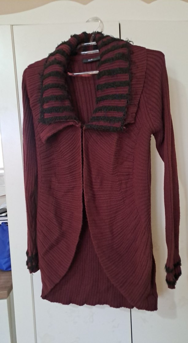 Bordo renk, uzun kollu, notched yaka detaylı triko hırka. s bedene ama esnek m bedenede uyar