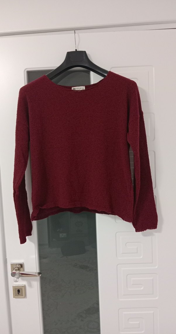 Bordo renkte, yuvarlak yaka ve uzun kollu kadın triko kazak. Yumuşak yünden örülmüş, bol kesim ve midi boyda, rahat ve sade tarz için uygun.