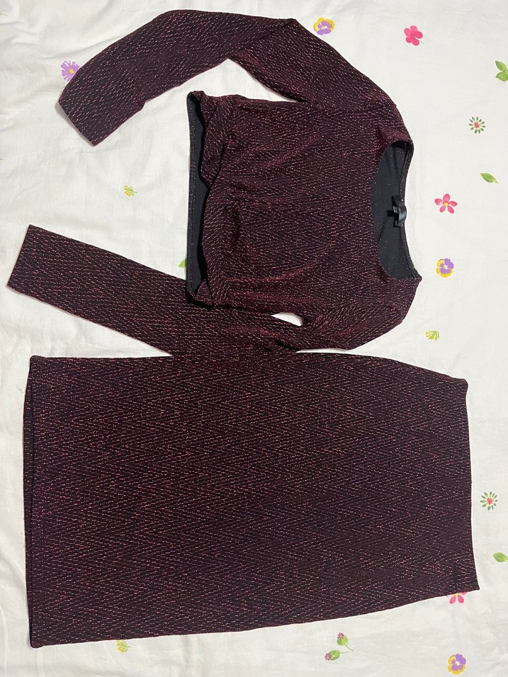 Bordo renk, uzun kollu, triko kumaştan, midi boy, fitted kesim kadın elbisesi. Rahat ve günlük kullanıma uygun.