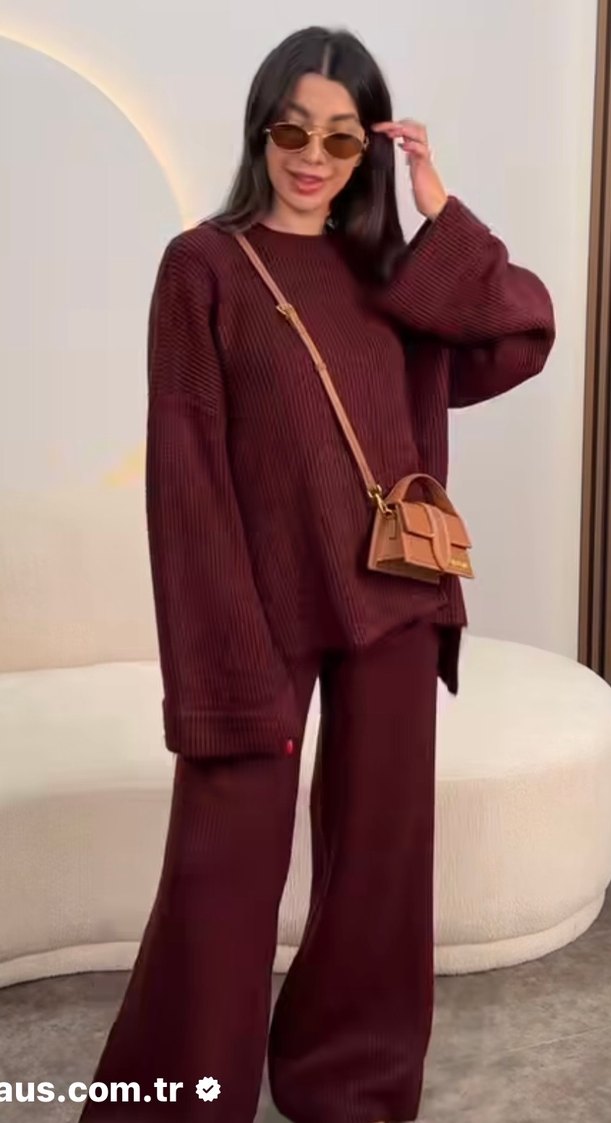 Bordo renkli, süet dokulu, triko kumaştan yapılmış, uzun kollu, salaş kesim ve bisiklet yaka kadın kazak ve pantolon takım hiç kullanılmadı sıfırdır