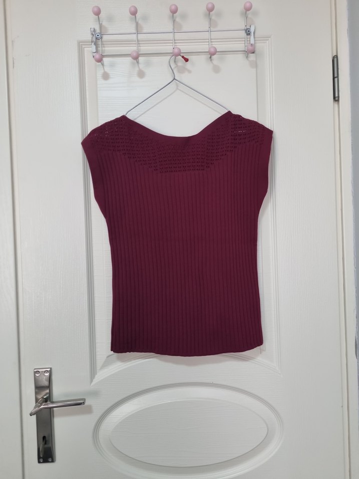 Bordo renkli, ince örme kumaştan yapılmış, kayık yaka ve kolsuz, vücuda oturan kadın triko süveter. Düz ve desensiz, günlük kullanıma uygundur.