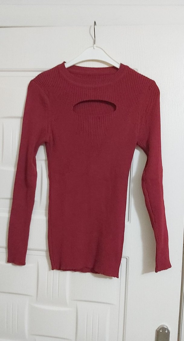 Bordo renkli, uzun kollu ve yuvarlak yaka, ince triko dokusuyla günlük kullanıma uygun, vücuda oturan bir kazaktır. Ön kısmında şık bir kesik detayı bulunur.