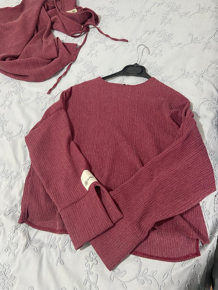 Bordo renkli triko kumaştan, uzun kollu, yuvarlak yakalı, rahat kesim kadın kazak. Desensiz ve gündelik kullanıma uygun, yumuşak dokulu bir parça.