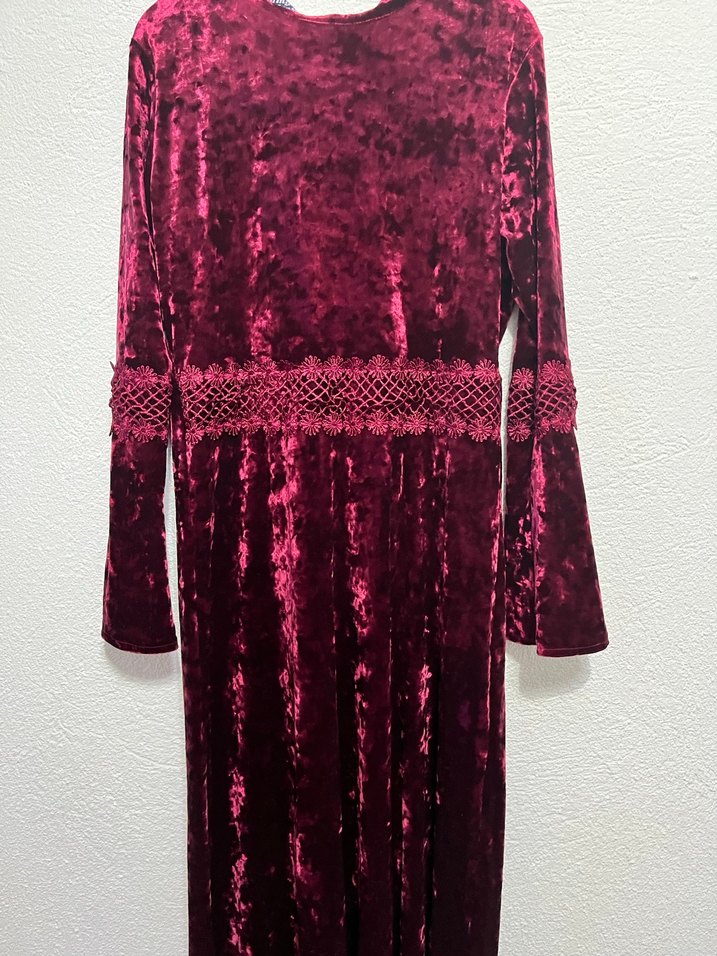 Bordo renkte, uzun kollu ve bel kısmında dantel detaylı uzun elbise. Yumuşak sentetik kumaştan üretilmiş, bol kesim ve yuvarlak yaka ile romantik akşamlar için ideal.