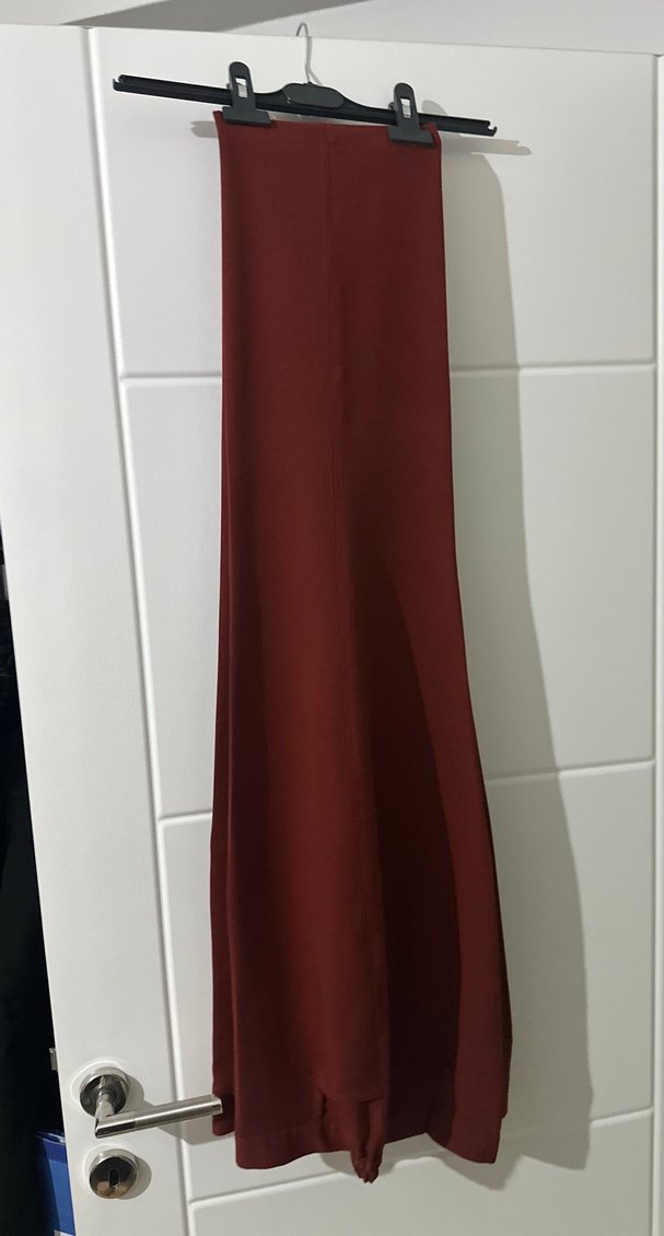 Bordo uzun dokulu kadın pantolon, dökümlü ve ipeksi dokulu. Düzenli kesim, minimal ve çağdaş stil, ofis için uygun.