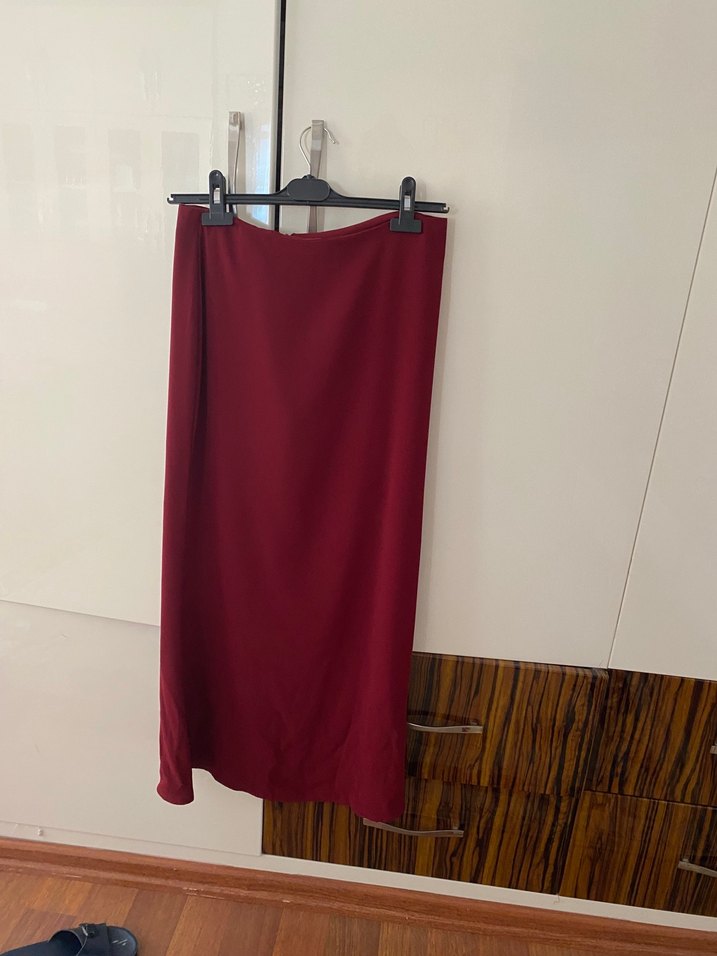 Bordo renkli, drapeli tasarıma sahip, ipeksi kumaştan yapılmış, vücuda oturan uzun etek. Minimalist sokak stili için uygundur.