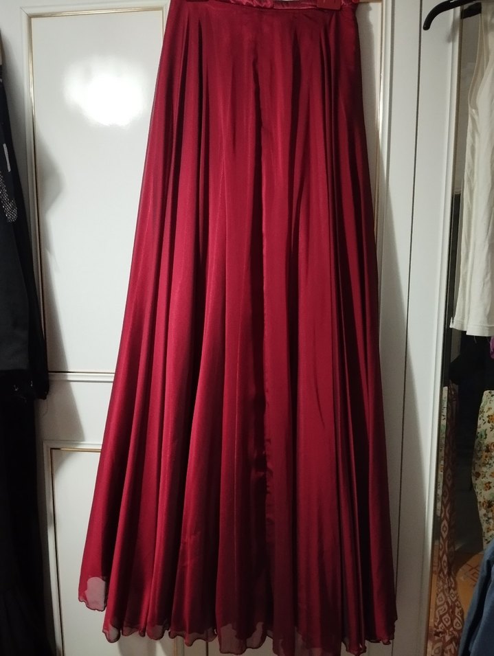 Bordo renkli, drapeli ve bol kesim uzun etek. Yumuşak sentetik kumaştan üretilmiş, minimalist ve çağdaş tarzıyla düğün ve şık kombinlere uygundur.