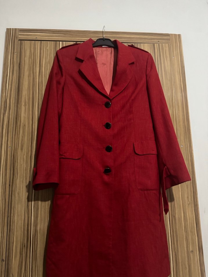 Bordo renkte, düğmeli, uzun kollu, saten görünümlü kumaştan yapılmış klasik kesim kadın kaban. Ofis kullanımı için uygundur.