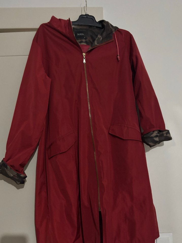 Bordo renk uzun, fermuarlı ve geniş kesim kadın yağmurluğu. Notlu yaka ve uzun kollu, sentetik kumaştan, günlük rahat sokak tarzı için uygun. ️