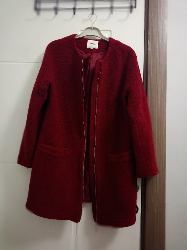Bordo renkli kadın uzun kaban, yumuşak dokulu kumaşa, yuvarlak yakaya ve ön ceplere sahiptir. İç kısmı astarlı ve sade tasarımlıdır.